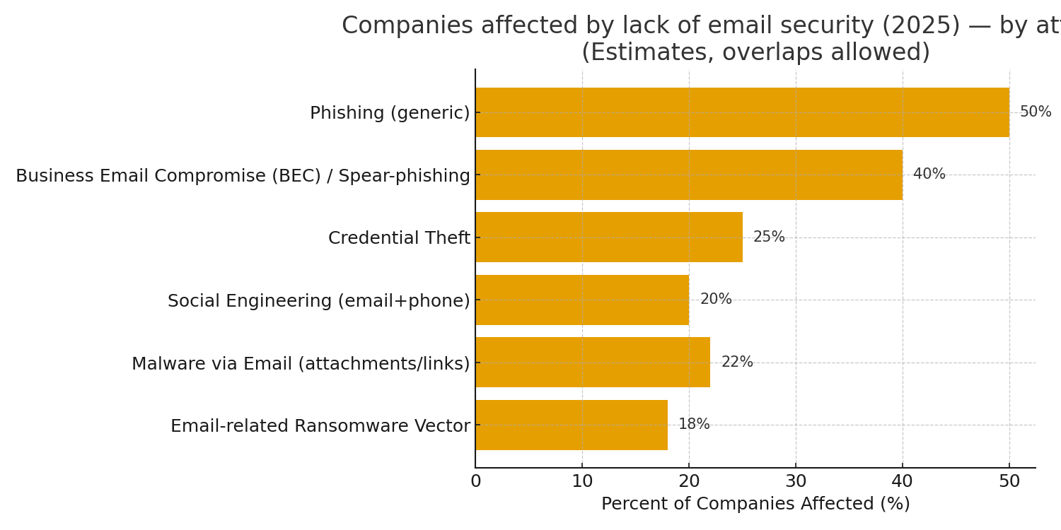 In 2025, email remains the hackerās top doorway ā and weak email security costs businesses dearly. Nearly 50% face phishing, 40% suffer BEC scams, and others fall to credential theft (25%), malware (22%), social engineering (20%), and ransomware (18%).